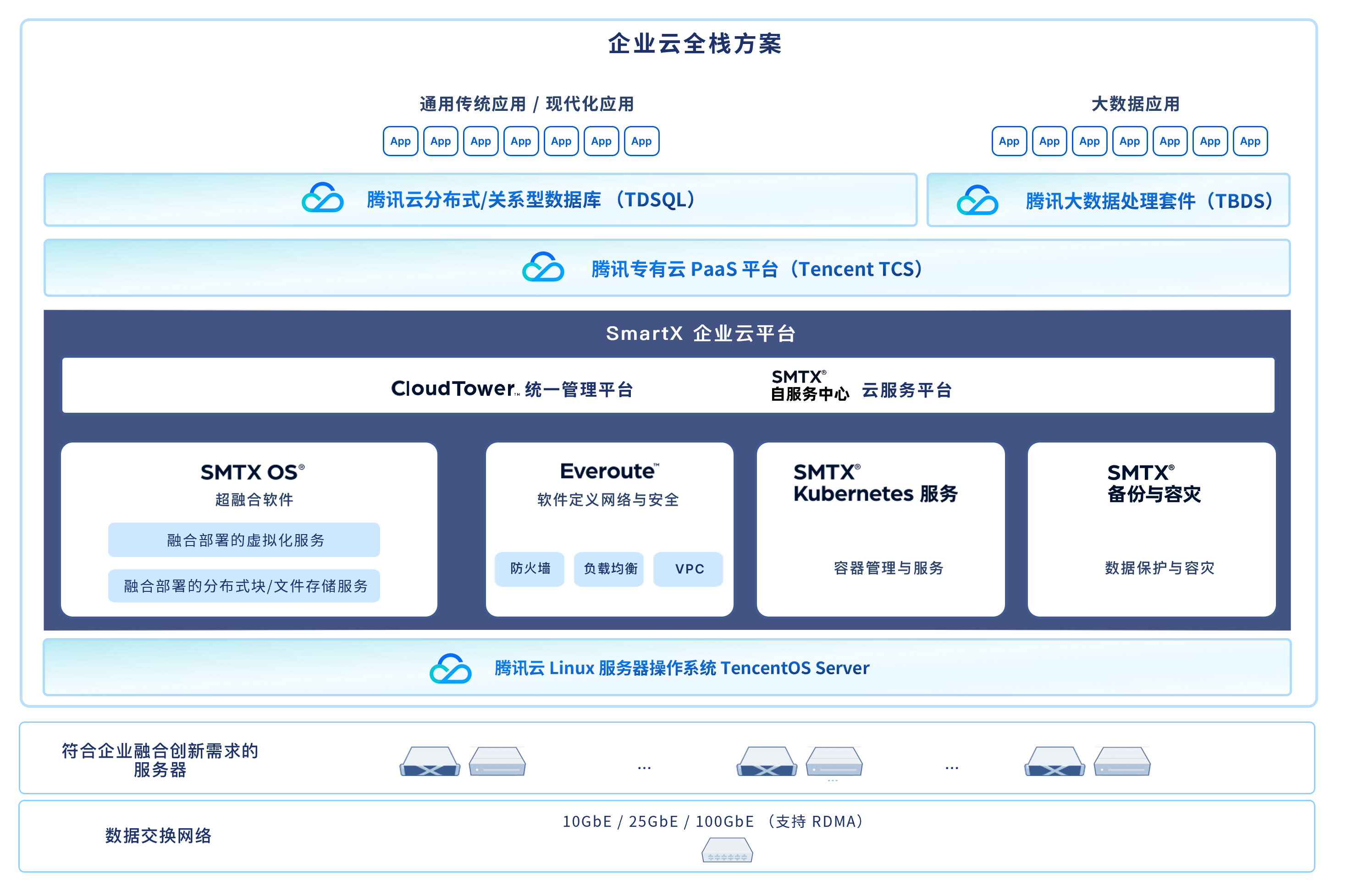 该方案将 SmartX 完备的 IaaS 能力和腾讯云 Linux 服务器操作系统(TencentOS Server)、专有云 PaaS 平台(Tencent TCS)和分布式数据库(TDSQL)相结合,最小仅需 3 节点起步,即可同时满足企业自建云与信息技术创新升级的双重需求。