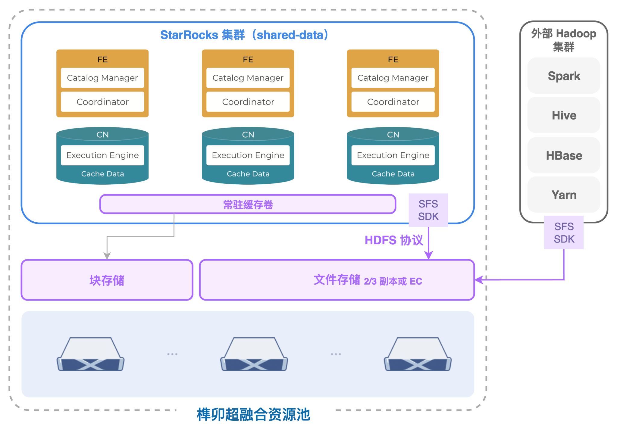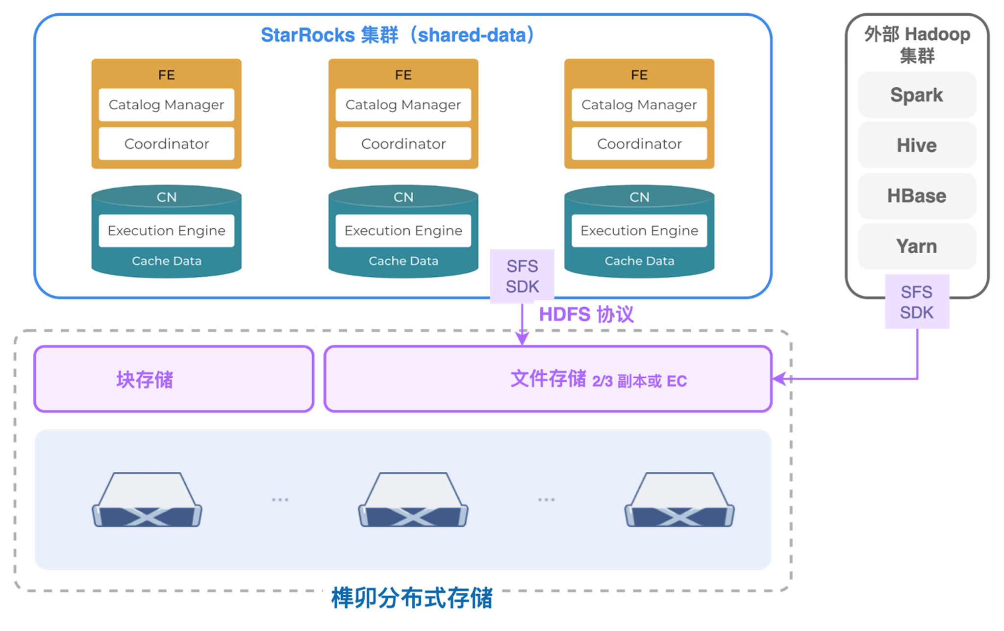 同时,SmartX 平台内置的分布式文件存储组件(SFS)通过 HDFS 协议为 StarRocks 提供高效的后端存储服务,并以副本或 EC 作为冗余策略保障数据的高可靠性。此外,SFS 还可为外部 Hadoop 集群提供统一存储支持,以确保多系统之间的数据互通。