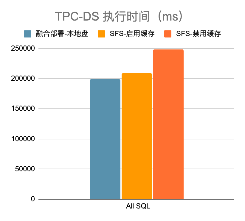 如下图所示,启用 CN 节点缓存后,SmartX 榫卯分布式存储 + StarRocks 联合解决方案的性能接近 StarRocks Shared-nothing 部署模式下的本地盘水平。