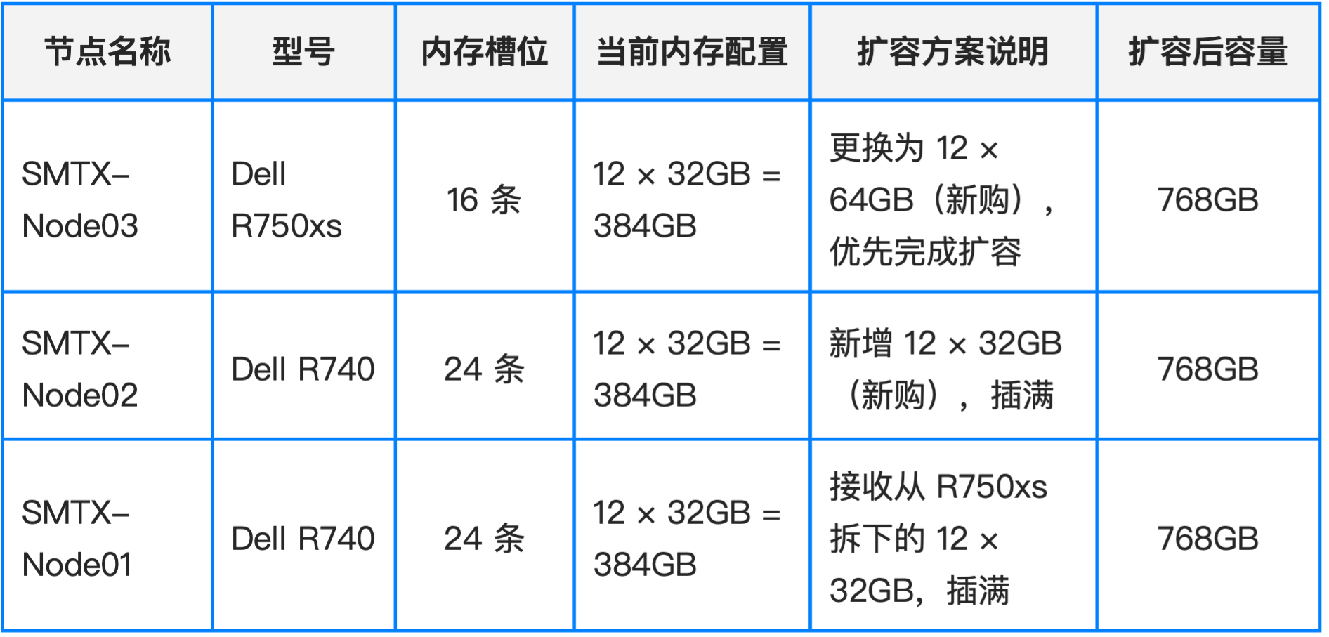 本次 SmartX 超融合三节点集群的内存扩容工作,旨在将每节点内存容量统一扩展至 768GB,通过“新增+内部调配”组合方式优化投资成本。具体方案如下: