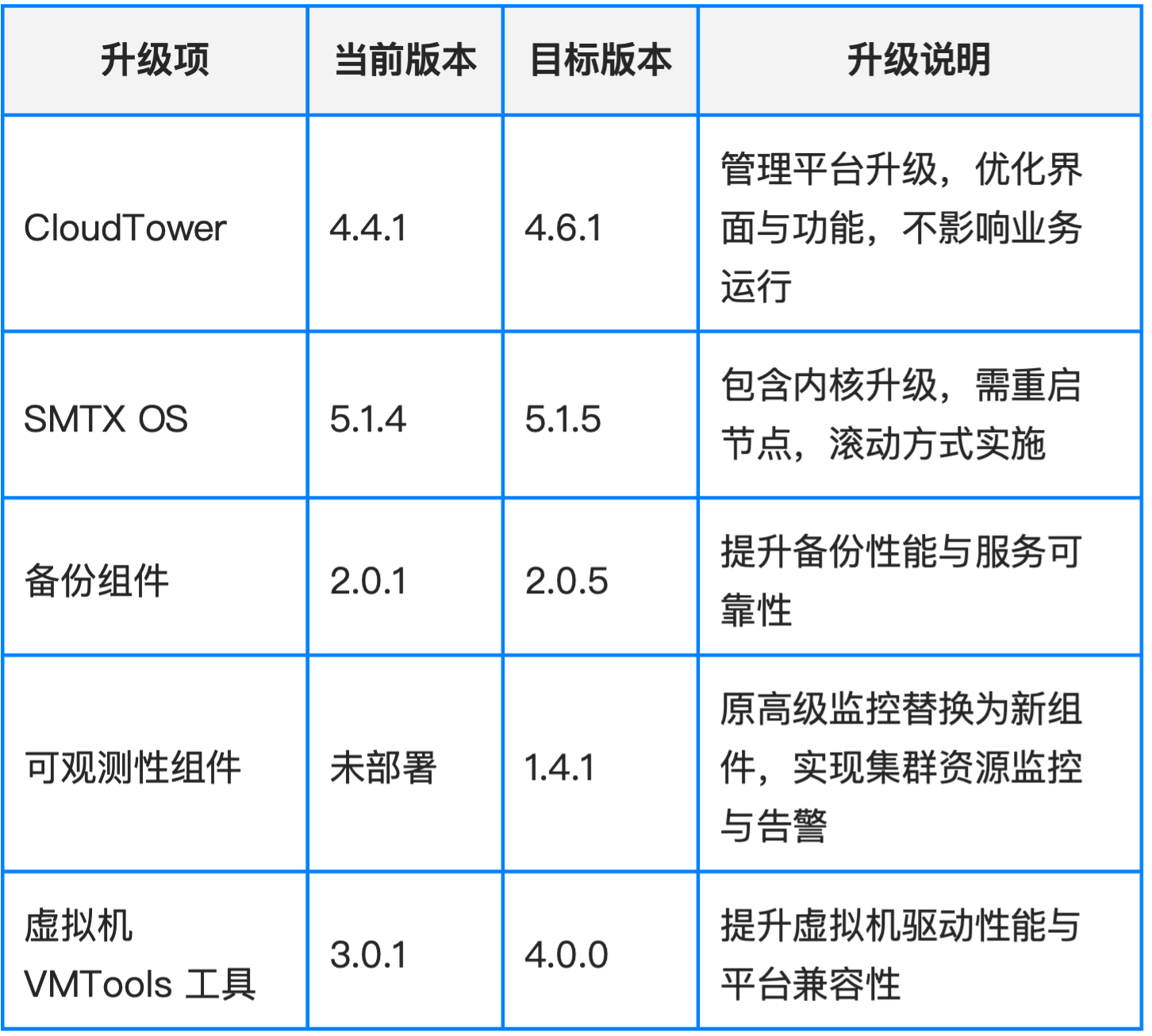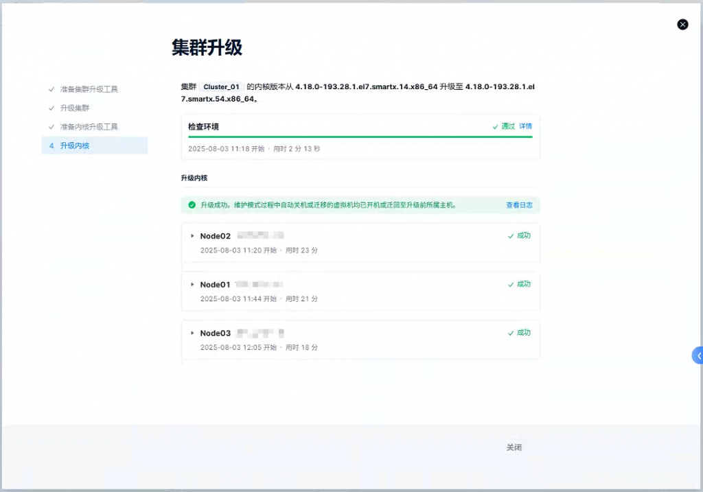 - 升级方式:由于该升级涉及内核版本更新,需重启节点,故采取与内存扩容一致的滚动升级策略:- 升级前由 CloudTower(升级中心)自动调度虚拟机热迁移至其他节点,并置入维护模式;- 先对 SMTX OS 执行升级,滚动升级完成后,对集群节点内核再次以滚动方式执行内核升级任务;- 节点重启后完成 SMTX OS 升级,自动退出维护模式并重新纳入资源池;- 整个升级过程中业务不中断,业务系统始终保持可用状态。