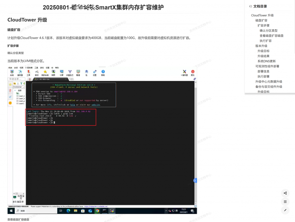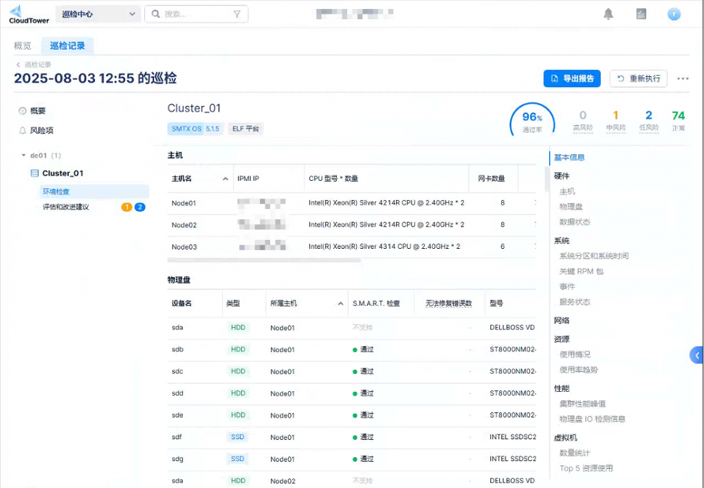 本次 SmartX 三节点集群内存扩容及平台组件升级工作已于计划时间内顺利完成,所有节点运行稳定,业务连续性保障良好。升级完成后,技术团队对系统状态进行了全面巡检与验证,未发现异常情况。