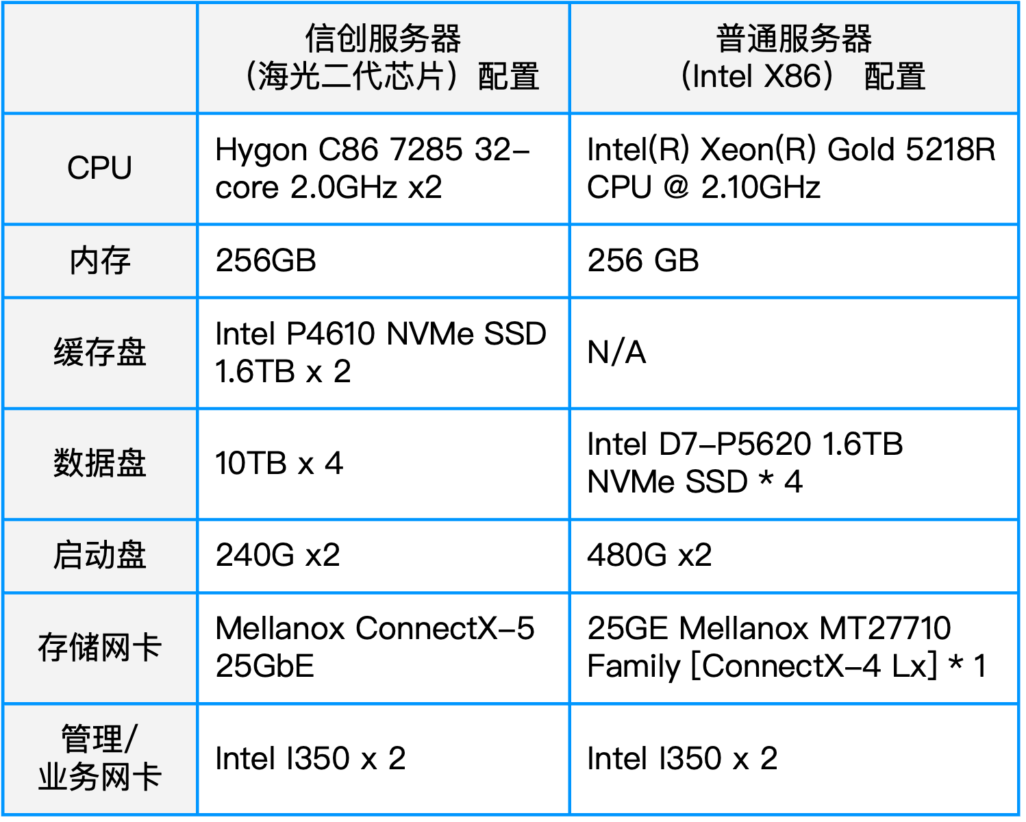本次测试在两套超融合集群环境下进行:一套是基于海光二号处理器的服务器(3 台)组成,另外一套集群是基于 Intel x86 服务器(3 台)组成。共计 6 台服务器用于对比测试,具体配置如下图所示。