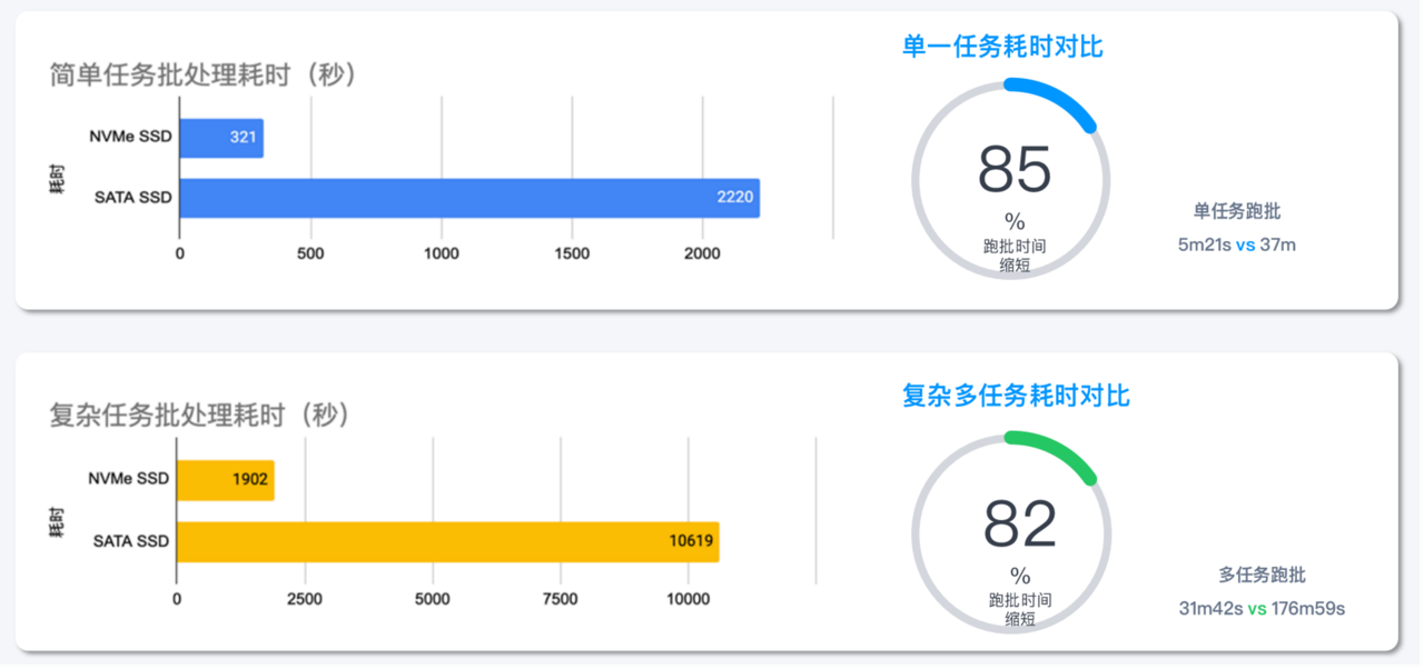 实际客户案例表明,采用 NVMe SSD 作为缓存层,性能提升显著。在数据库简单场景中,跑批时间可以缩短 85%;在复杂场景中,跑批时间可以缩短 82%。因此,我们建议在数据库业务场景下优先采用 NVMe SSD 构建缓存层。