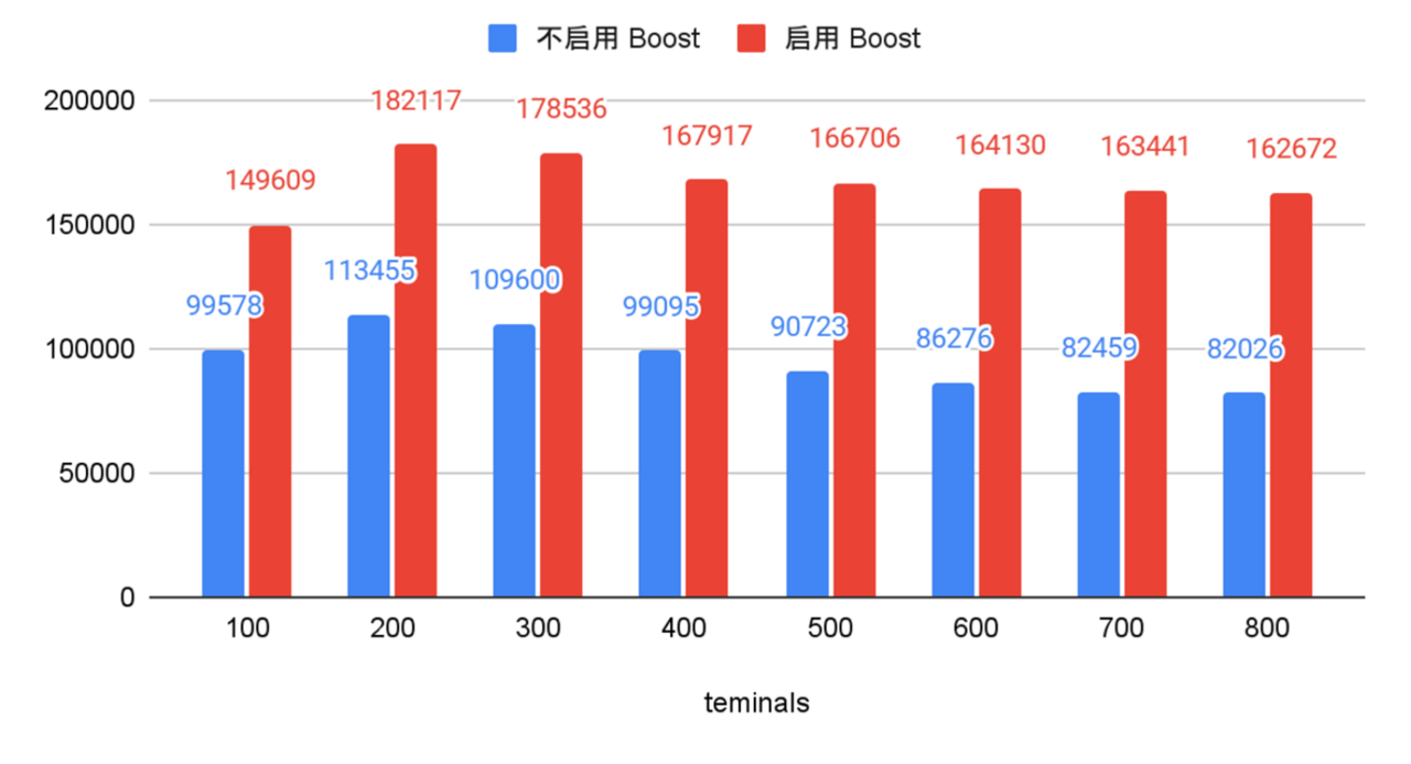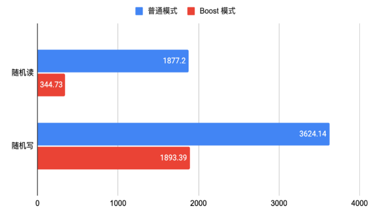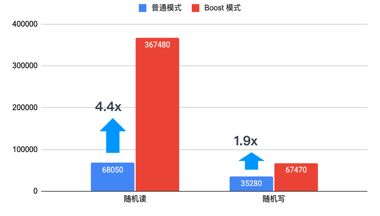此外,启用 Boost 模式后,数据库性能提升同样明显,提升比例在 50%~98% 之间。