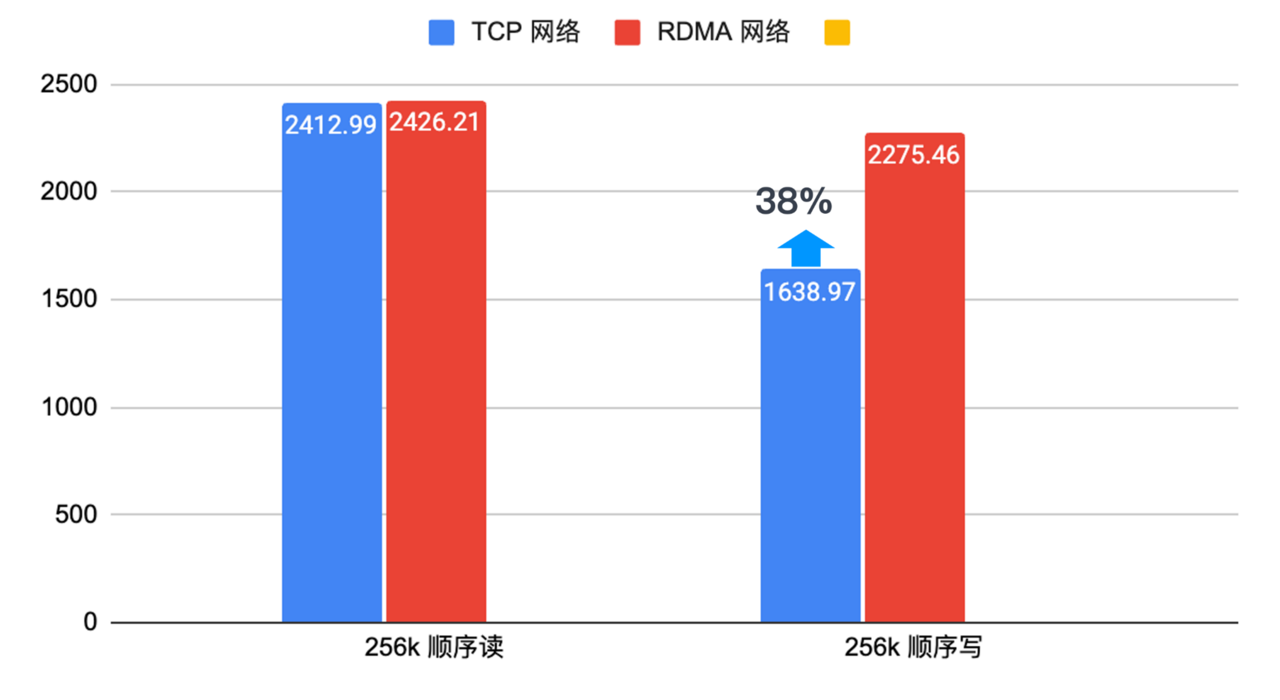 启用 RDMA 网络协议有助于进一步减少分布式存储软件中的网络延时,并提升带宽。启用 RDMA 以来,我们对比了顺序读和顺序写的性能,发现数据库在分布式存储环境下的顺序写带宽提升高 38%,有助于解决高并发写入性能瓶颈。