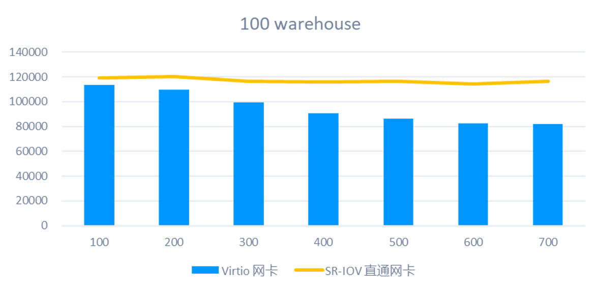 我们对比测试了 SR-IOV 直通网卡和默认的 Virtio 虚拟网卡在数据库压测下的性能表现。从测试数据来看,在所有测试场景中,SR-IOV 的性能都优于 Virtio。