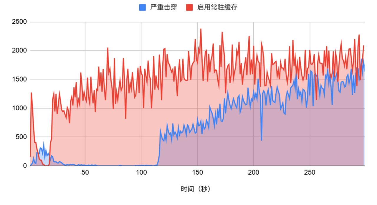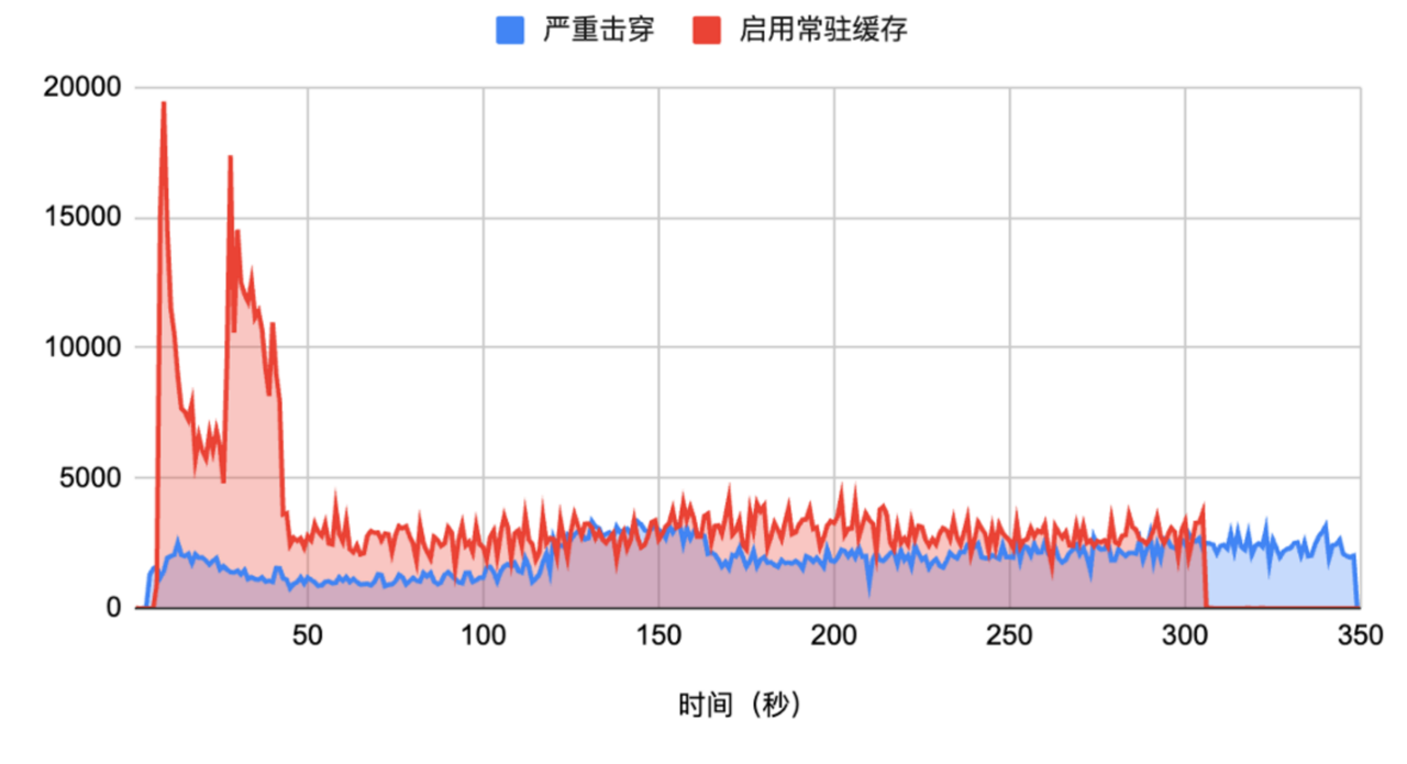 再通过数据库的 TPS 实际性能评估严重击穿和启用常住缓存后的不同表现: