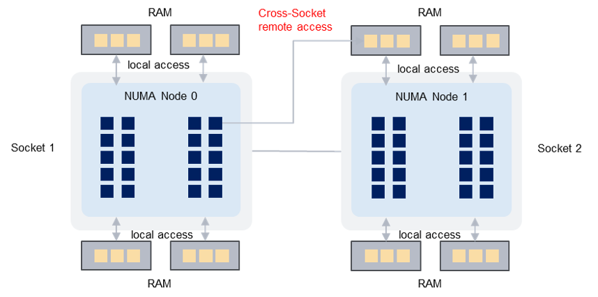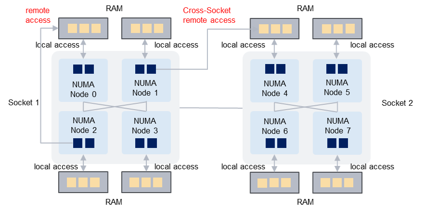 - 当确需使用大量核心时,优先保证 vCPU 位于同一 CPU 插槽,以缩短节点访问距离。内存分配时也应尽量避免超出单节点可用内存上限。