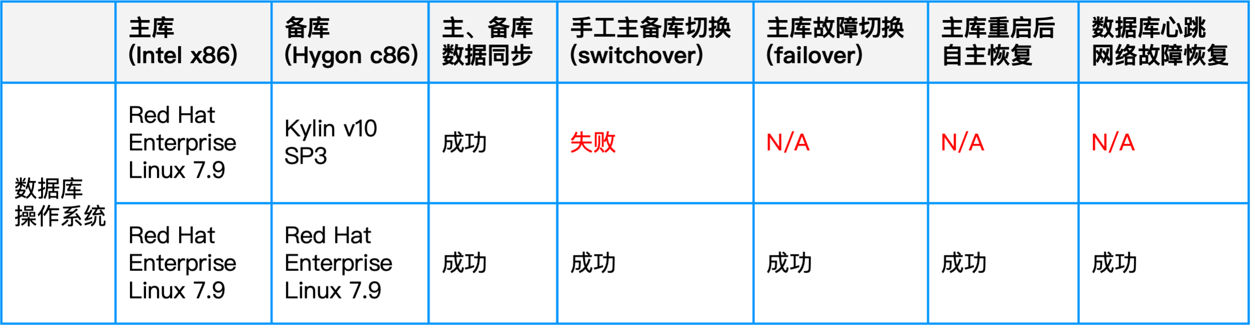 - 测试一:主库使用Red Hat Enterprise Linux 7.9,备库使用 KylinOS v10。在该组合下,数据同步与一致性均无问题,但在主备切换、网络故障等场景中出现失败。