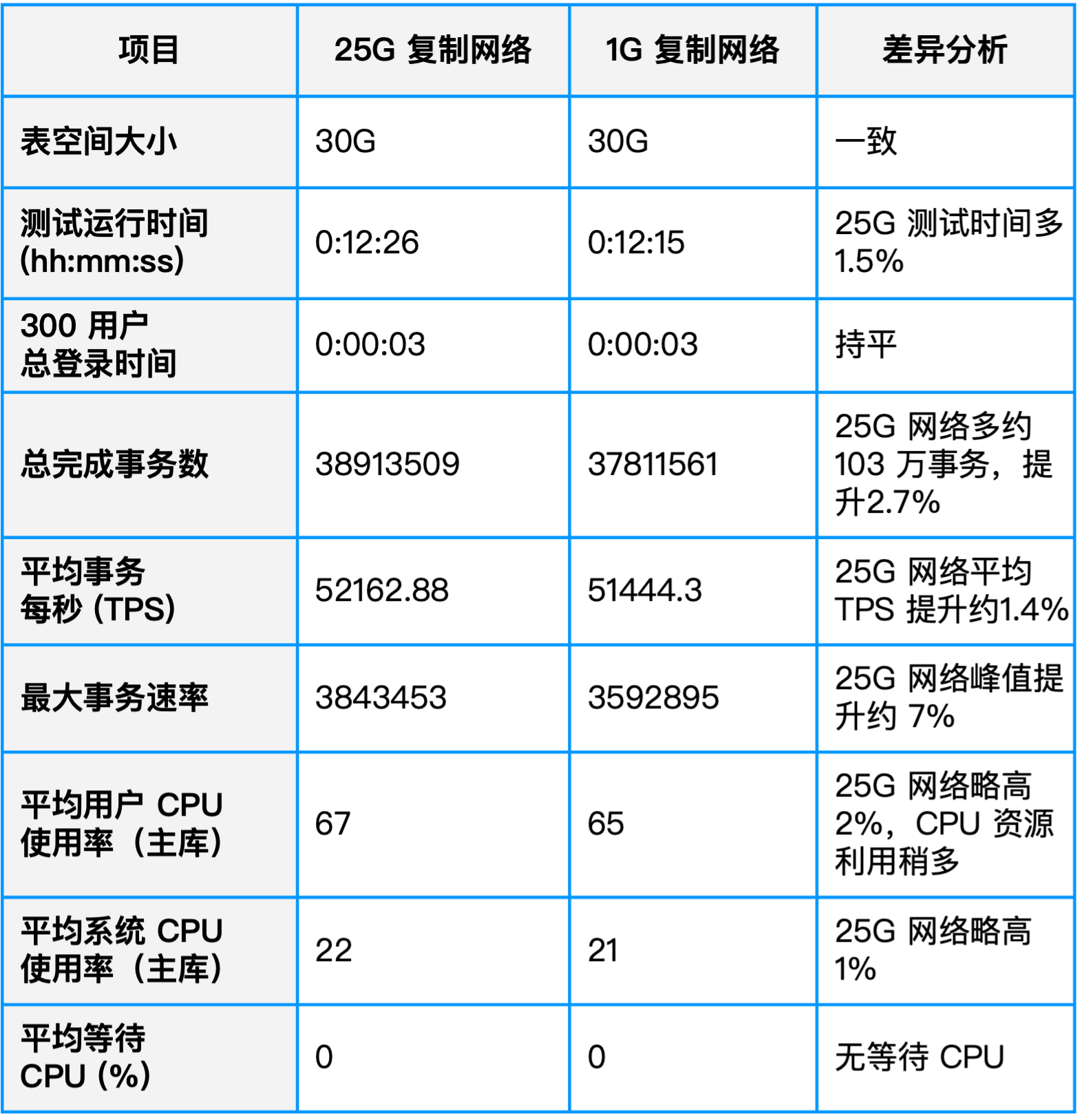 进一步的网络带宽测试表明,在 25G 网络与 1G 网络下,ADG 复制带宽占用均约为 200+ Mbps,性能差距不大,说明 1G 网络即可满足大多数场景的需求。