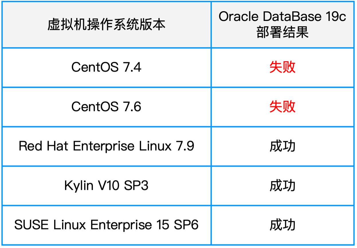 从测试结果可以看到:Oracle 19c 数据库在海光芯片上运行,对于操作系统的要求相对 Intel 芯片更加严格;Linux 内核版本较低容易导致安装失败,建议使用 Red Hat Linux/CentOS 7.9 或以上版本。