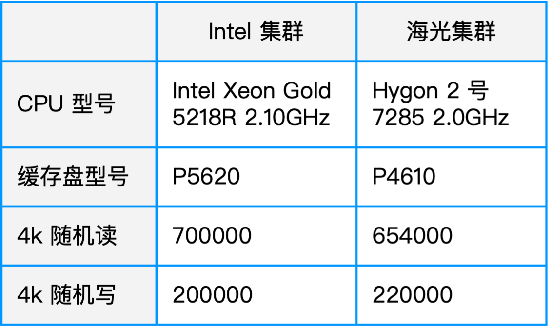 测试环境中,Intel 集群与海光集群的硬件配置并不是完全对等,但总体接近: 首先,两者的 CPU 主频接近(Intel Xeon 5218R 主频为 2.1GHz,而海光 7285 主频为 2.0GHz);此外,SSD 缓存盘型号虽有差异,但两者性能上也是比较接近的,Intel 集群上的 SSD 随机读写性能上略优。