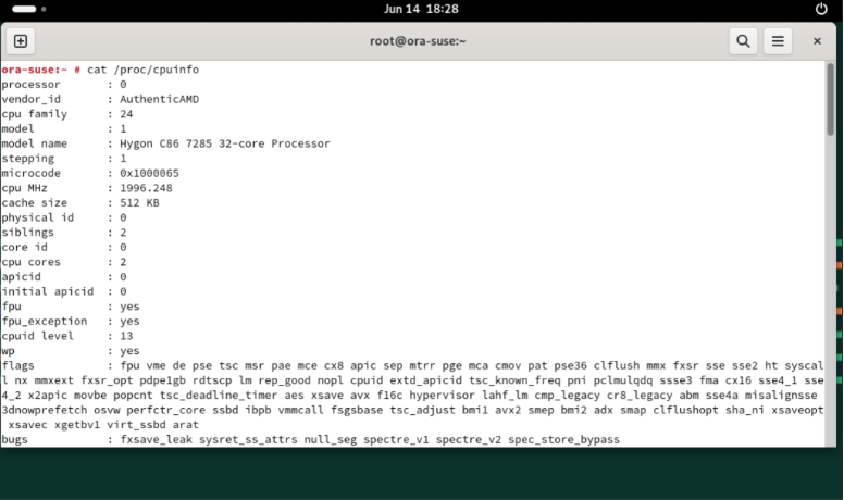 SmartX 团队选取了 5 个常见版本的 Linux 操作系统进行部署测试。其中,Red Hat Enterprise Linux 7.9、Kylin V10 SP3 和 SUSE Linux Enterprise 15 SP6 三款操作系统能够正确识别海光 CPU,并正常完成安装和运行 Oracle 19c 数据库。
