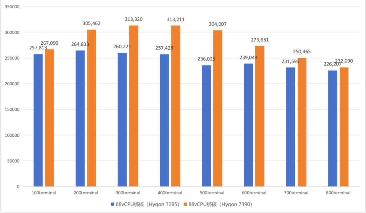 实测显示,海光 7390(2.7GHz,256MB L3 缓存)相比 7285(2.0GHz,128MB L3 缓存)在 Oracle 数据库的 TPC-C 压测中性能平均提升 14.38%,最高性能差距可达 28%。