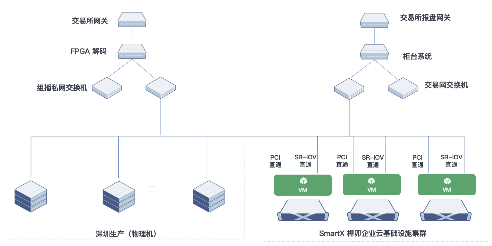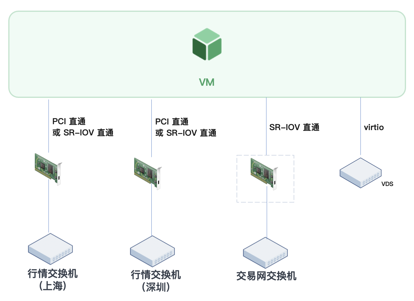 - 极速交易:交易链路和 TCP 行情链路都可以通过 OpenOnload 功能实现加速,在虚拟化环境中使用 SR-IOV 创建的 Virtual Function 也继承了 OpenOnload 特性,且由于交易链路带宽流量需求本身较小,SR-IOV 虚拟化还可以进一步提高网卡硬件的使用率,因此采用 SR-IOV 网卡联通交易所。