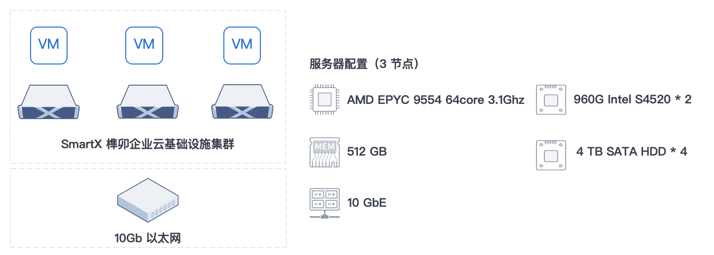 因此,该证券机构计划针对该业务场景在虚拟化环境中的性能表现开展测试,并最终选择了“AMD 芯片+10Gb 以太网+SmartX 原生虚拟化 ELF”的测试方案,与生产环境的物理机进行对比。