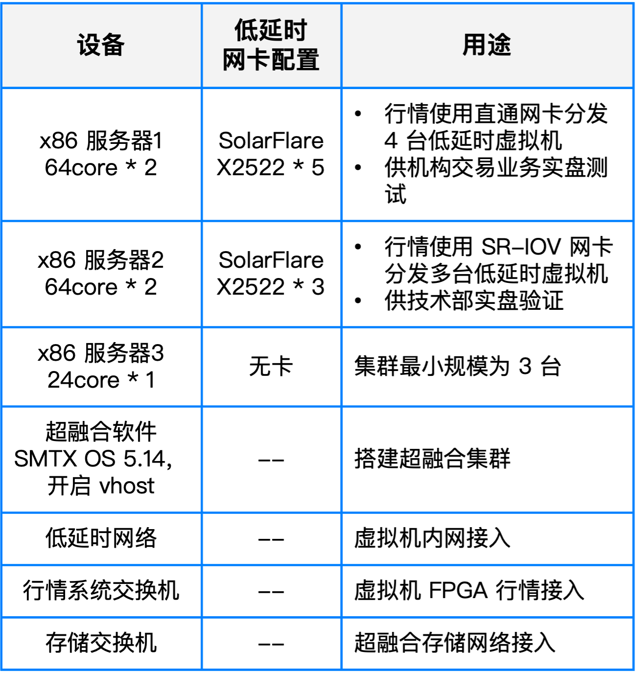 本次测试服务器采用 AMD EPYC 9554 CPU 并配置 Sloarflare 直通卡 4 张,共 8 个网口。虚拟机配置如下:独占 24C,128G 内存,2 个 PCI 直通网口,1 个 virtio 网口。计划每个主机上运行 4 个虚拟机。测试环境设备配置并不完全统一,具体硬件配置如下: