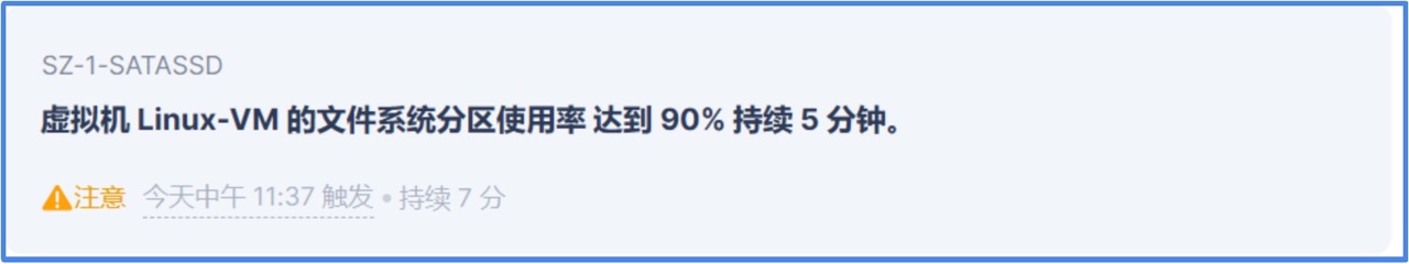 由于该挂载点正是业务数据写入目录,若持续堆积将直接导致写入失败。借助可观测性平台“告警”与 VMTools 的“可视”组合能力,运维人员在问题发生前即完成风险识别与处理,仅用数分钟完成分区扩容与服务保障,避免了更大范围的业务影响。