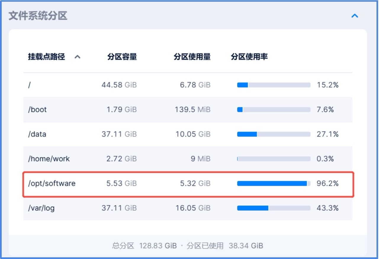 客户在 CloudTower 启用自定义告警功能,提前配置了针对虚拟机文件系统分区使用率的阈值告警策略:当任一分区使用率超过 90% 且持续 5 分钟,即触发预警。随后通过 VMTools 提供的文件分区可视化能力,管理员无需登录客户机,便可直观查看每个挂载点的使用详情,迅速定位到 /opt/software 分区空间紧张。