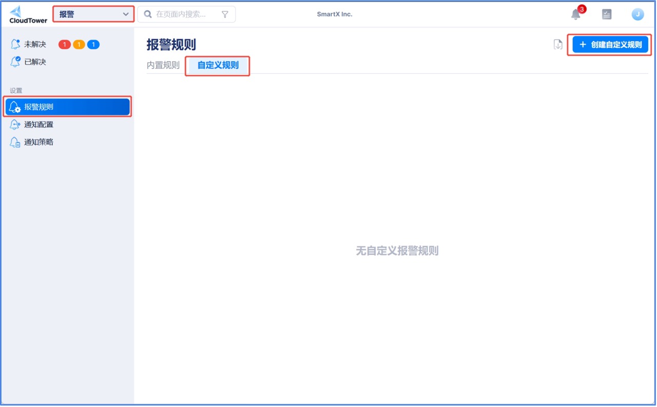 1. 在 CloudTower 的报警主界面左侧的导航树单击报警规则,然后在报警规则界面单击自定义规则。