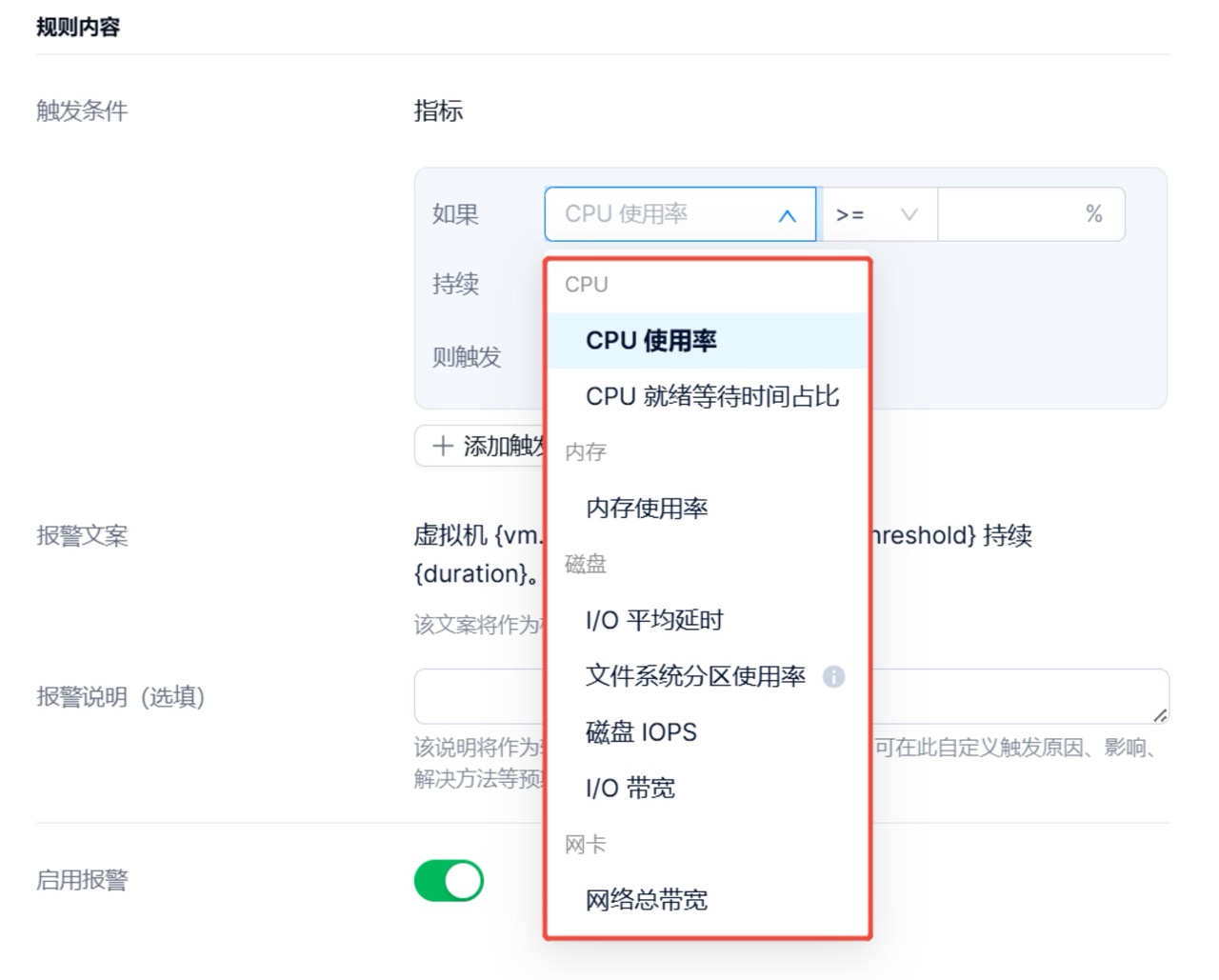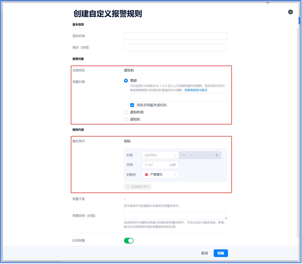 - 支持为单台或多台虚拟机分别配置指标类告警规则。
