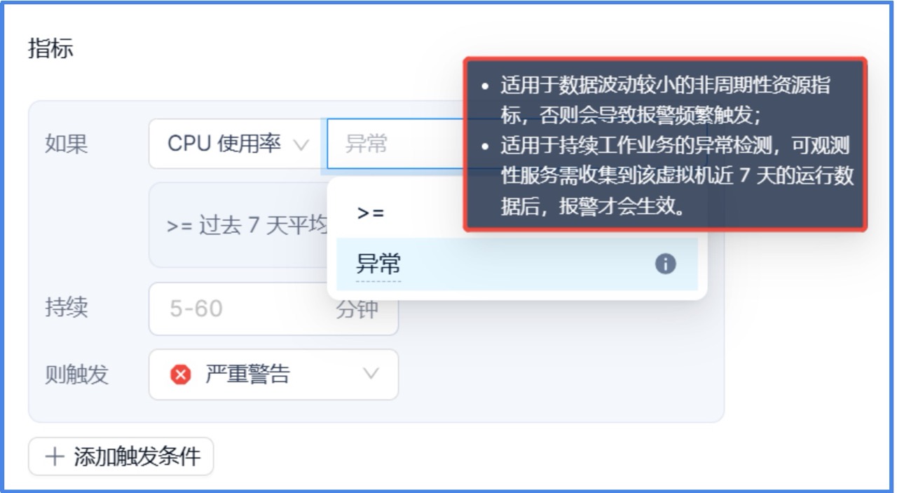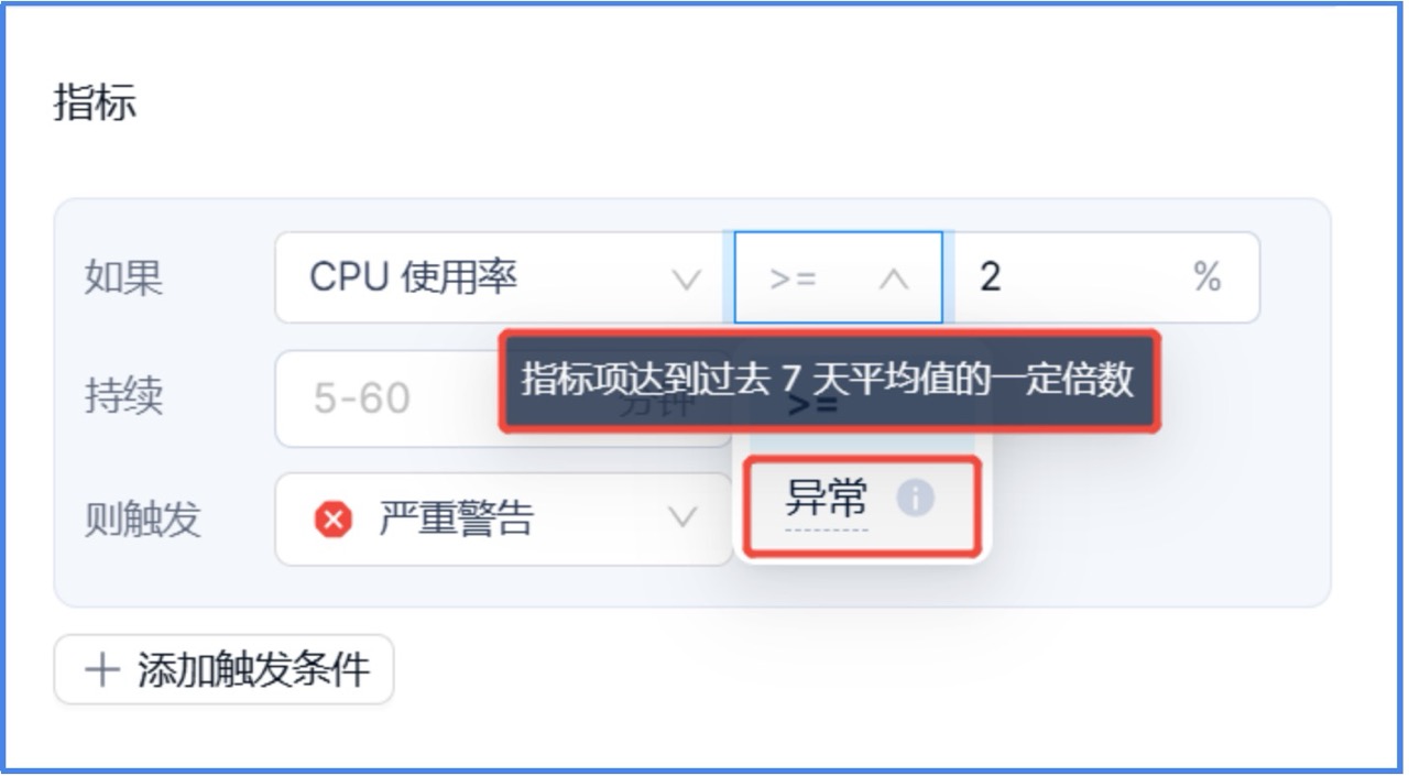 4. 除了支持监控指标高于指定使用率,还支持”异常”判断。对于不同用户业务的压力可能无法得知具体的性能基线,而通过配置“指标项达到过去 7 天平均值的一定倍数,且持续 N 分钟时,触发相应的告警“,可避免大量的手动操作。