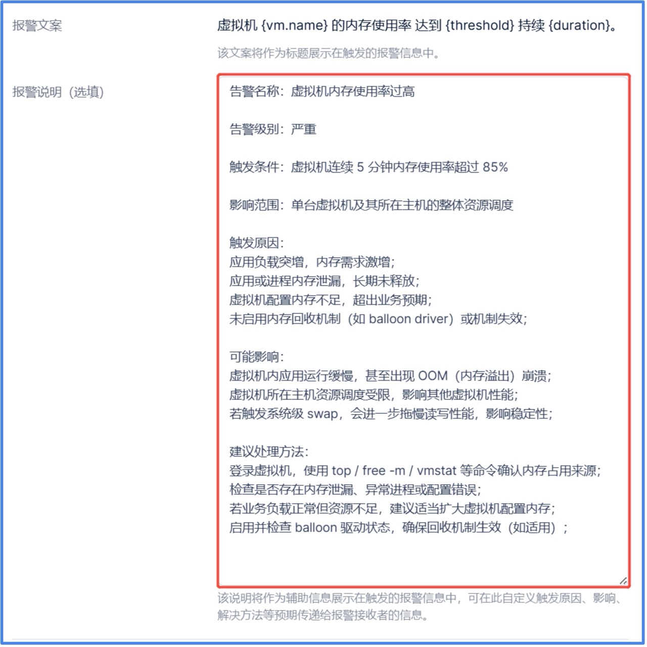 5. 支持对告警编辑报警说明,作为辅助信息展示在触发的报警信息中,可在此自定义触发原因、影响、解决方法等预期传递给报警接收者的信息。