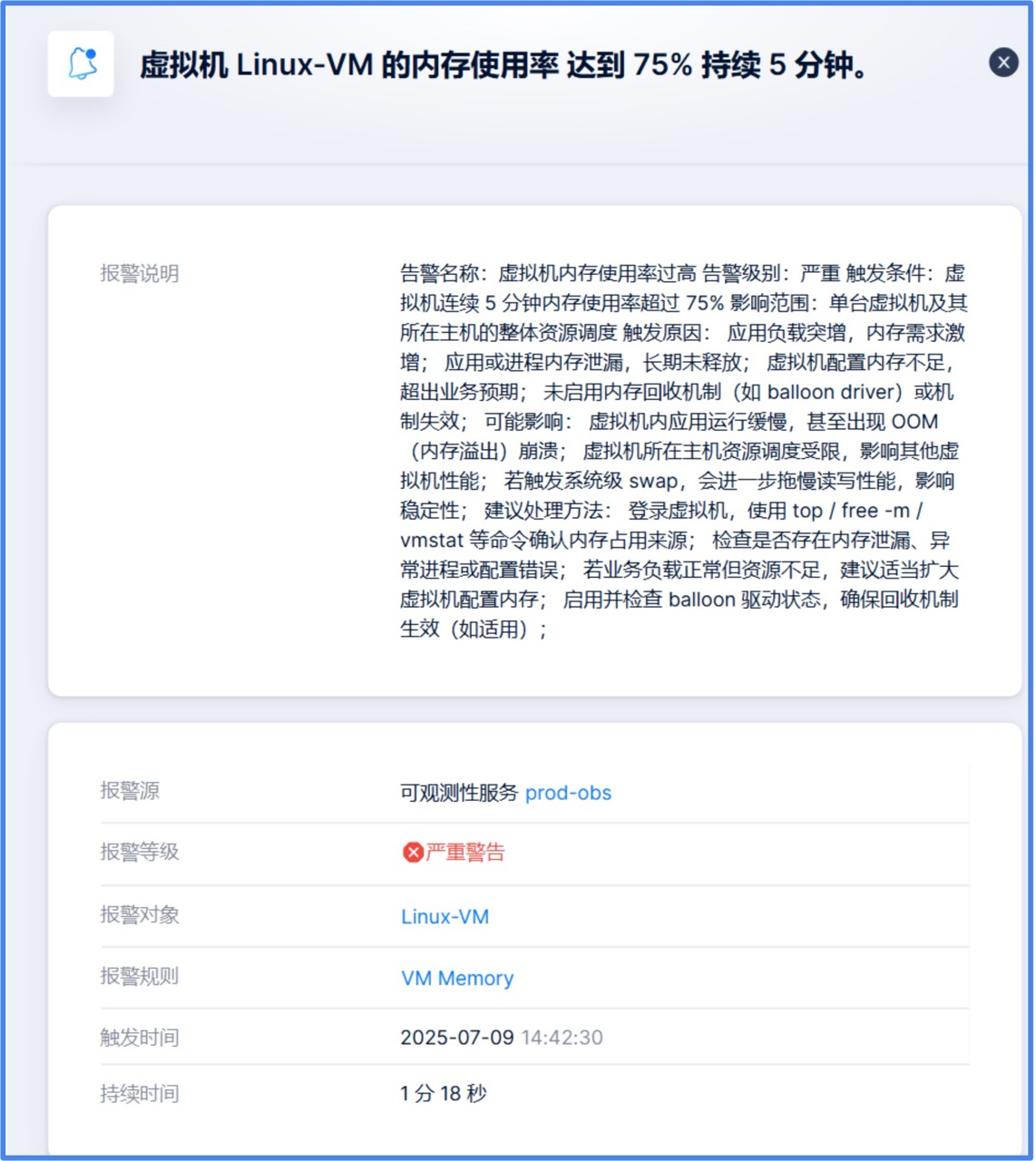 当虚拟机出现内存持续高占用、磁盘 I/O 长时间异常等持续性问题时,传统平台无法结合多个维度的监控数据进行判断并及时发出预警,往往要等业务方感知到异常后才被动处理,缺乏对“持续异常状态”的主动识别能力。