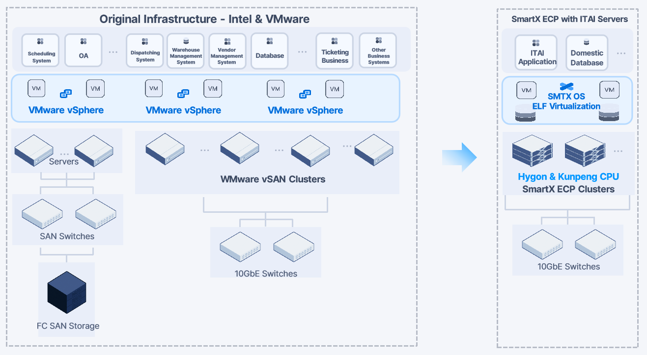 Currently, leveraging the SmartX Enterprise Cloud Platform (ECP) and in-house migration tools, SmartX has assisted numerous transportation enterprises—covering railways, aviation, ports, and logistics—to accelerate the domestic replacement of VMware virtualization and vSAN. These enterprises utilize SmartX’s native hypervisor – ELF – to build resource pools for core business systems, databases, disaster recovery, VDI, development, testing, and more scenarios.