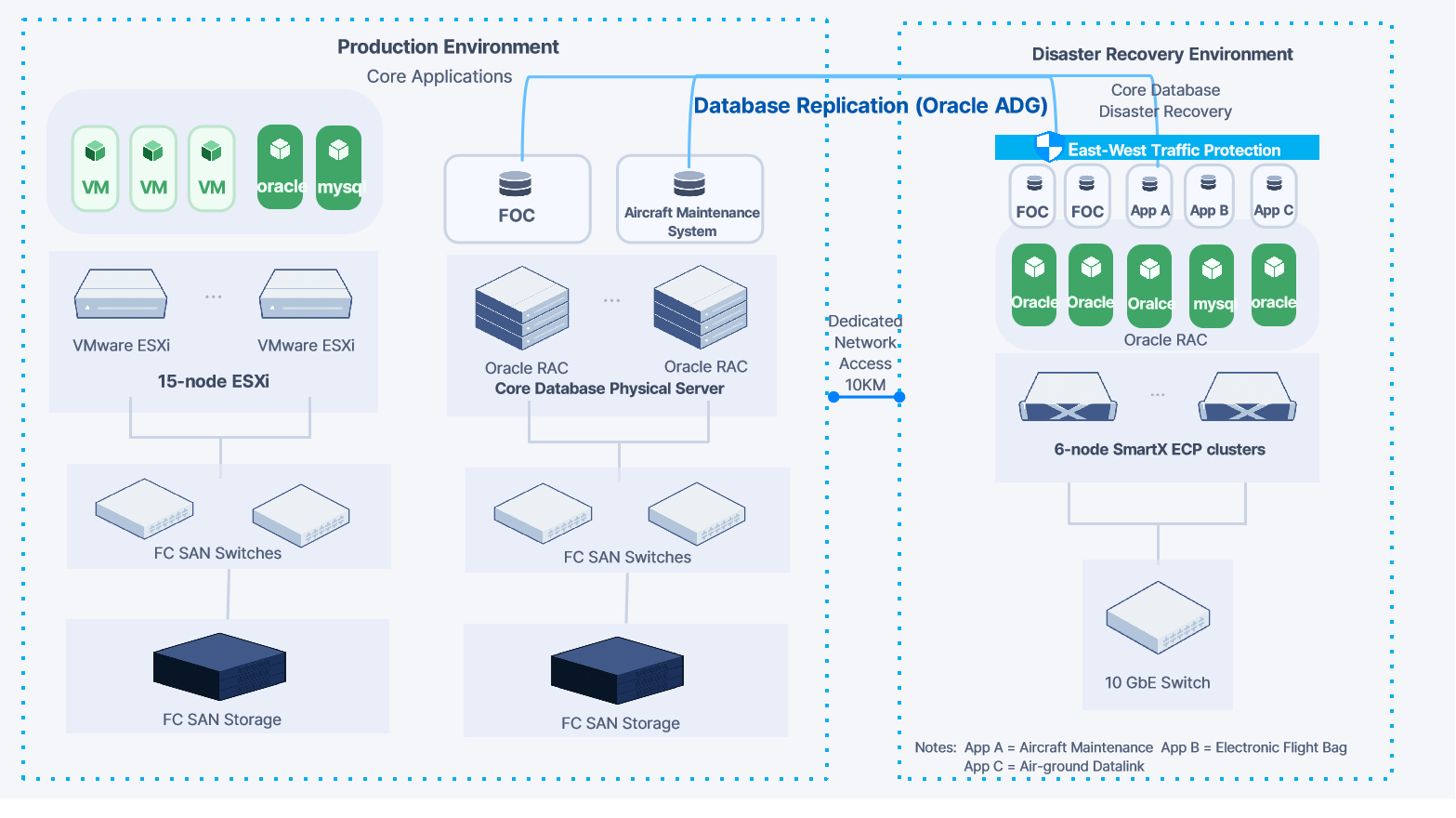 A regional airline originally relied on a “VMware virtualization + FC SAN storage” architecture to support most of its business systems, while core databases for systems such as FOC (Flight Operations Control) and aircraft maintenance were deployed on physical servers as Oracle RAC.