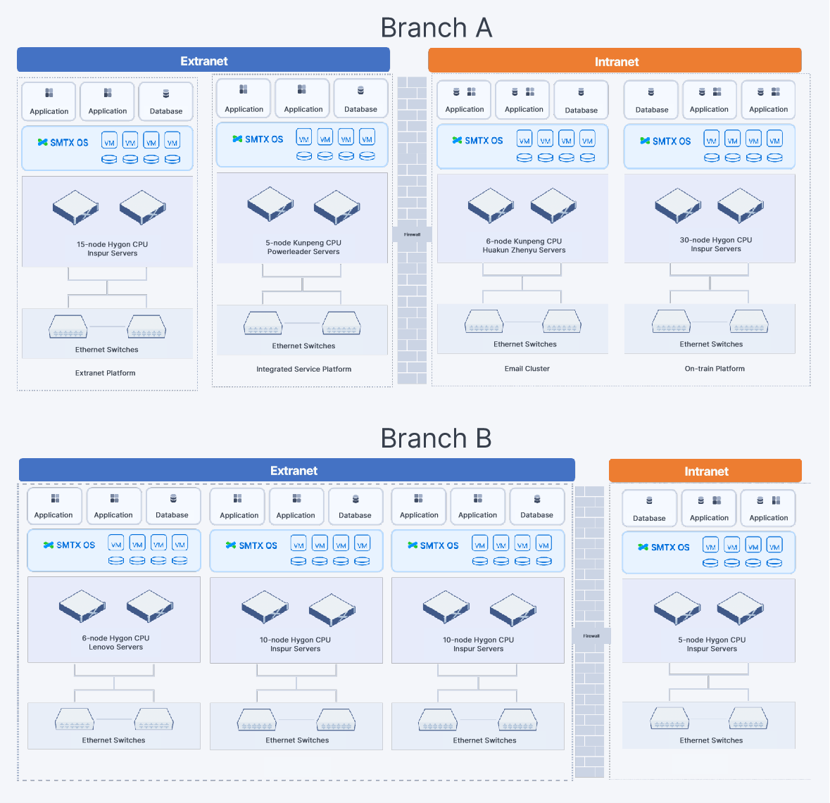 - Branch B: Deployed more than 30 SmartX ECP nodes (based on Hygon CPUs) across its intranet and extranet data centers to support a wide range of applications and databases. Additionally, a regional department deployed three non-ITAI nodes to host management systems for workflow, HR, and training/exams.