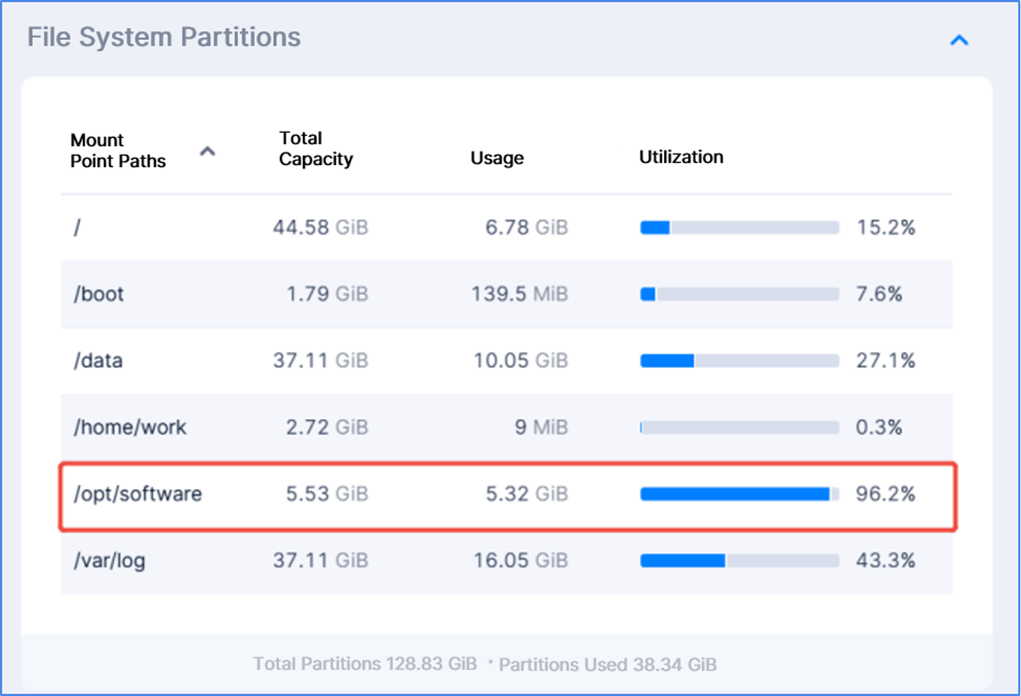 With VMTools’ intuitive visualization, the team could instantly see every mount point’s path, total capacity, and usage. They quickly spotted the culprit: the /opt/software partition used for business data writes. Acting before it hit 100%, they prevented a shutdown that would have halted key data transactions.