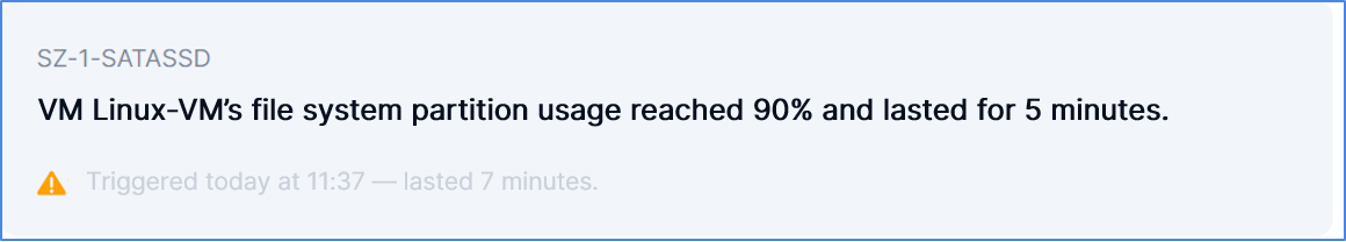 On traditional virtualization platforms, a “disk full” alert often lacks detail, making it difficult to identify the specific partition that is running out of space. At Company A, a core business VM suddenly experienced data write failures, leading to frequent application errors. Because the platform displayed only the VM’s overall disk utilization, the IT team could not quickly determine which partition was full. They had to log into the VM for manual investigation, which significantly delayed troubleshooting and resulted in business disruption.