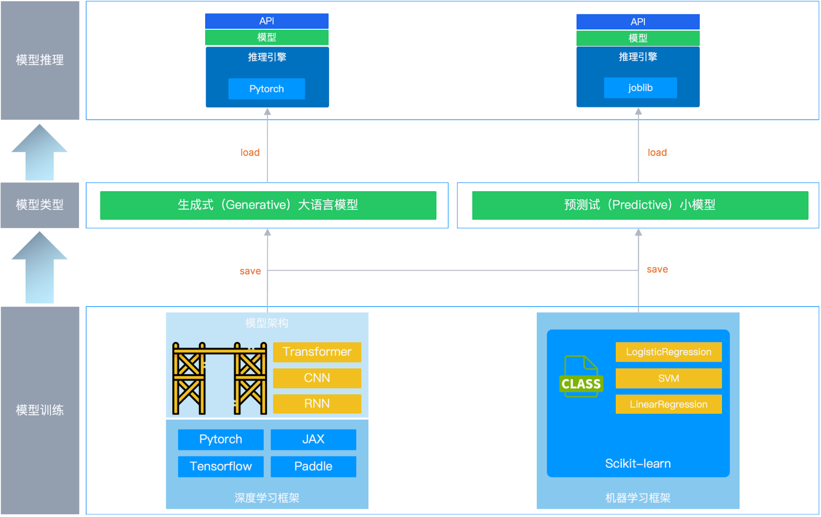 模型训练好后一般被保存成 joblib、pkl 等格式,通过采用推理引擎加载运行。此时推理引擎主要负责读取并加载训练好的模型文件、提供模型预测 API 接口、调用模型对象 predict 方法进行预测,并将预测结果返回给用户。