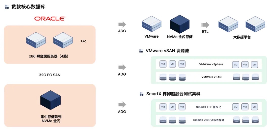 为了平衡性能、成本和可靠性,用户决定验证国产超融合架构承载备库的可行性。由于用户此前已在生产环境基于 SmartX 榫卯超融合(采用原生虚拟化 ELF)承载了除核心账务系统 Oracle 数据库之外全部 100+ 生产业务系统的 MySQL 数据库从库,用户计划对榫卯超融合的 Oracle 备库承载能力进行测试验证。