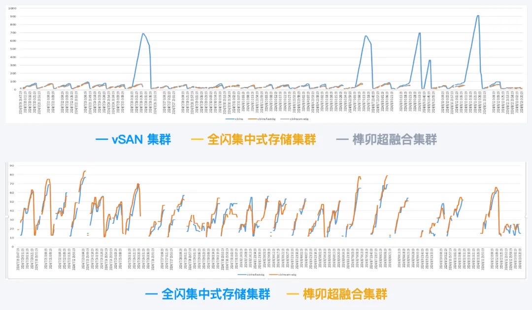 通过为期近一个月的监控,可以看到,vSAN 集群大部分时间延迟可以满足要求,但由于性能不稳定,在一个月内出现了多次延迟急剧增加的情况,最大达到了 900 多秒;而全闪集中式存储和榫卯超融合集群的性能则非常稳定,高峰期延迟稳定在 100 秒以下,最大延迟分别是 78 秒和 85 秒,表现远优于 vSAN 集群。