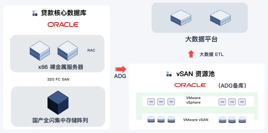 对于存款、贷款等核心业务系统,该区域银行采用 Oracle 数据库(主库+ADG 备库)进行支撑,其中主库采用“物理机+国产高端全闪集中式存储”的架构,备库采用 vSphere+vSAN 支持运行。随着网贷业务的快速发展,业务数据量急速增长,为了缓解核心数据库压力,部分查询业务由备库完成,报表和报送等数据处理业务由备库转发至大数据平台完成。不过,使用过程中用户发现备库的性能逐渐难以满足日趋增长的业务需求: