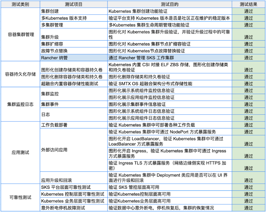 基于用户侧 SmartX 超融合集群多年的稳定运行表现,用户使用 3 台海光服务器部署了基于 ELF 虚拟化的 SmartX 超融合集群,对 SKS 进行了测试。结果显示,SKS 通过了功能、性能、集成插件以及可靠性等数十个项目的测试,尤其是在自动化运维、滚动更新、日志管理和故障诊断等关键功能上,具备 VMware 同等替代能力。