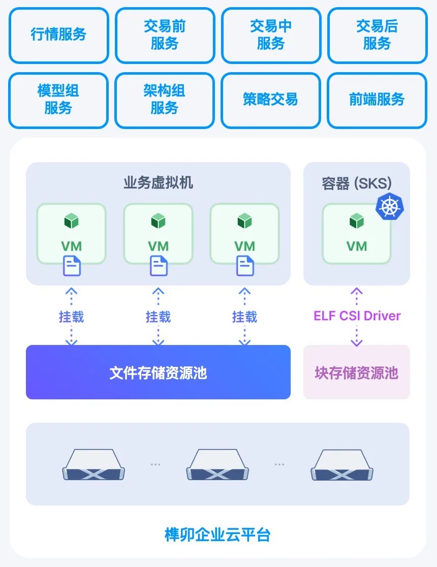 固收业务是某证券公司的核心业务板块,涉及 200+ 虚拟机,包含一系列服务组件及数据库。服务组件在在处理请求时,本地会生成离线日志及文档,需要存放在文件存储中,以上文件后续会用于固收平台的模型优化或数据分析处理。同时,用户的部分服务组件已完成容器化改造,需要运行在 Kubernetes 集群中。面对多种计算环境与数据存储需求,用户希望基于统一的基础设施同时承载虚拟机与容器,同步满足数据库应用的高性能块存储需求、固收业务的文件存储需求和容器存储需求。