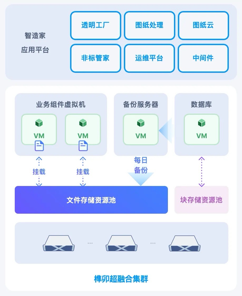 在对不同自建云方式进行考察后,用户最终选择榫卯超融合和 SMTX 文件存储,并通过爱数实现数据库备份。在实际搭建过程中,用户原本计划采购 7 个服务器节点与一套 NAS 存储运行整套业务系统,而基于 SMTX OS + SMTX 文件存储仅需 4 节点就可以运行工作负载、存放图纸文件,并作为备份存储端。该部署方案减少了一半硬件节点数量,同时节约了额外采购一套 NAS 的成本,大幅降低硬件投入。