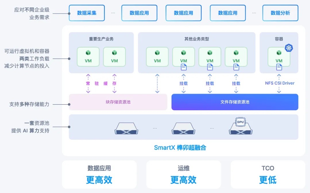 - 减少硬件投入:以一套超融合架构同时支持业务虚拟机并提供高性能文件存储和块存储,无需额外采购 NAS 存储,降低了架构复杂度,节省了机房空间。