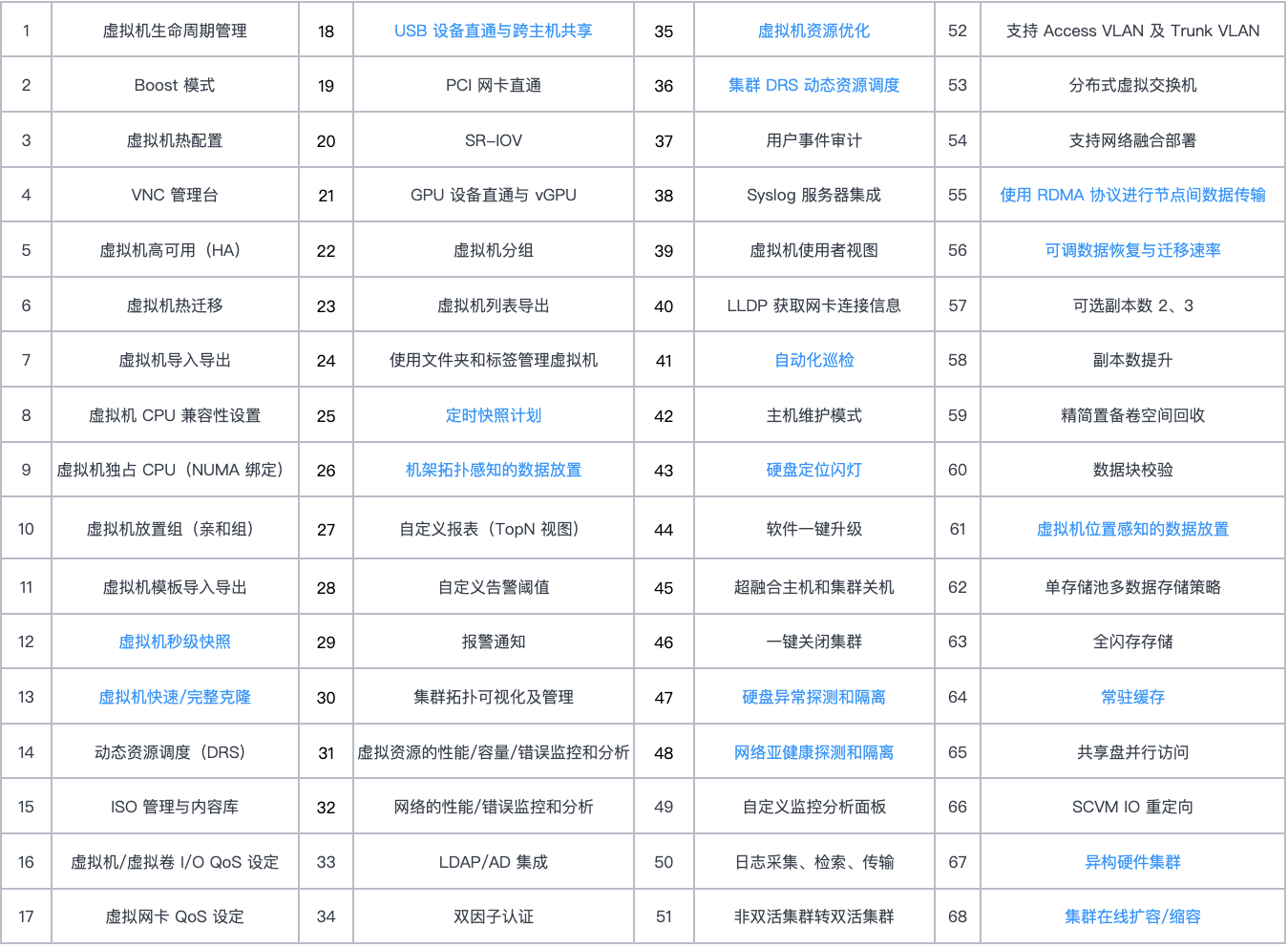 华安证券对国外虚拟化平台与 SmartX 榫卯超融合的虚拟化功能和运维管理能力进行了全面对比,覆盖虚拟机生命周期管理、资源调度、虚拟机网络与安全、运维与管理、存储策略与数据保护等 68 个具体功能。