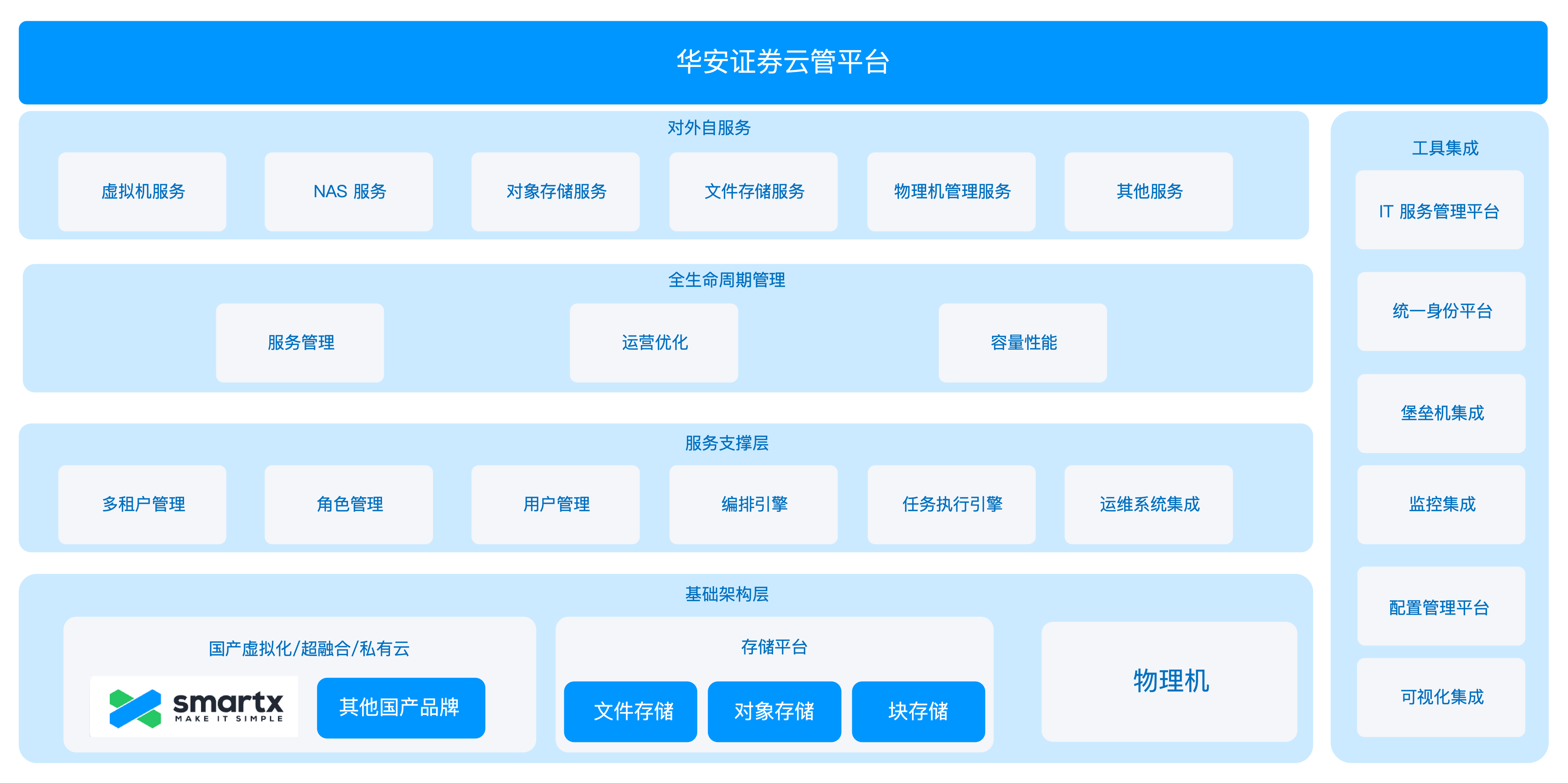 随后,华安证券在生产环境持续推进榫卯超融合平台的规模化落地,目前已扩展至 200+ 节点,覆盖测试区、生产区、三方接入等区域,承载网上交易、手机交易和托管交易等核心系统。得益于 SmartX 软硬件解耦的特性,华安证券可以基于 Intel、海光、鲲鹏等多款品牌服务器部署,构建覆盖多架构、多芯片、多服务器品牌的“一云多芯”云平台,灵活适配不同阶段业务需求。