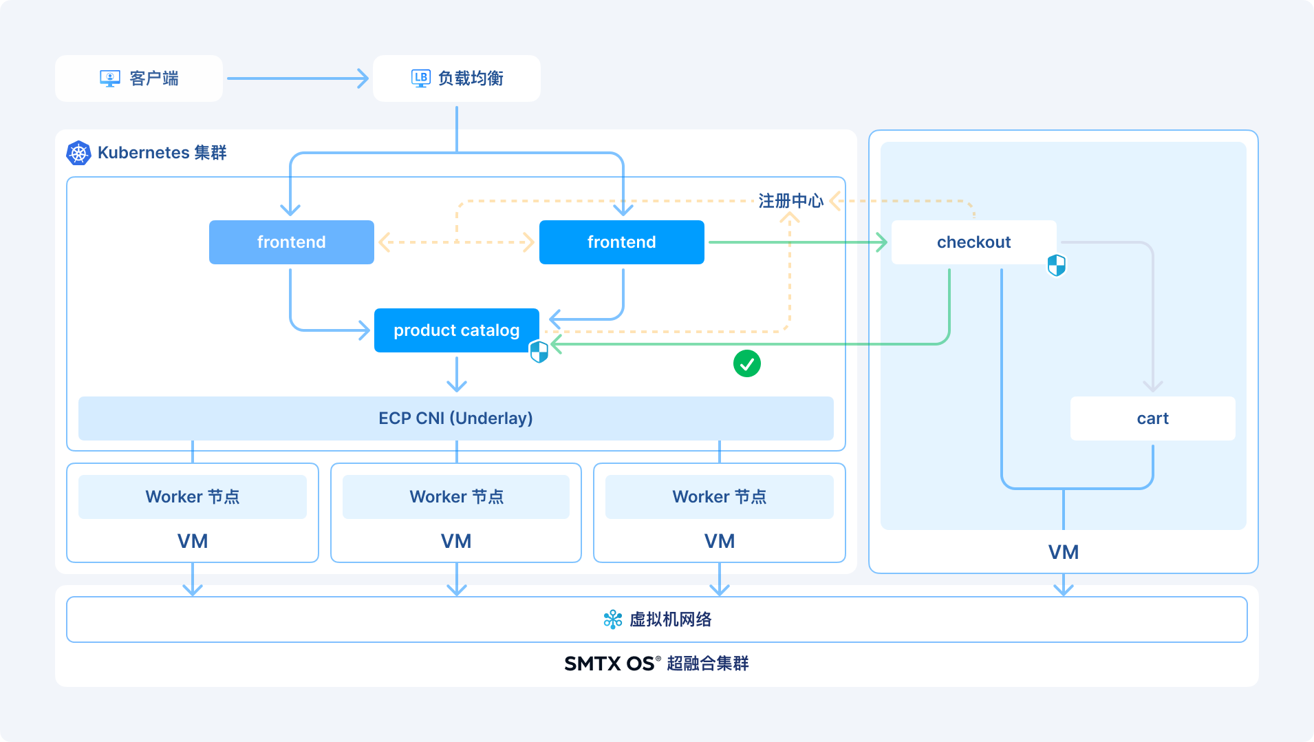 SmartX 所提供的网络安全组件,可基于扁平化网络架构实现传统虚拟机应用与容器应用互联互通;同时提供统一的安全策略管理,可提升访问效率和性能,增强东西向流量的安全性。