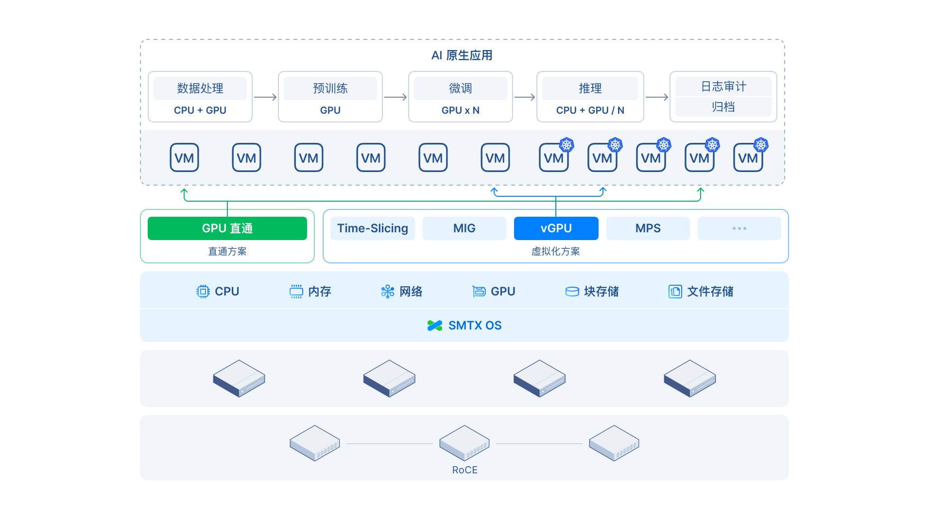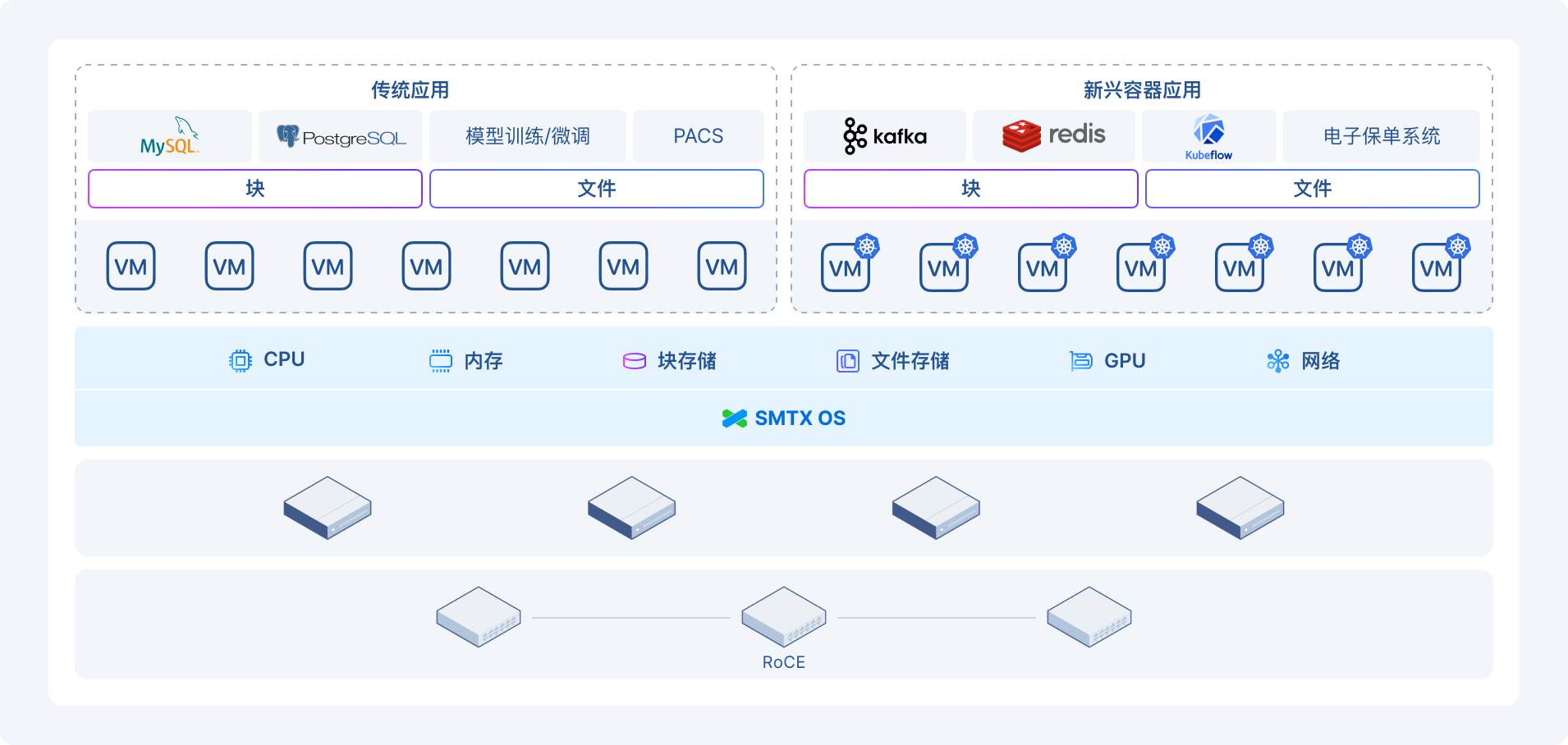 SmartX 虚拟化容器融合基础设施(VM-Container Converged Infrastructure,即 VCCI),在单一系统中提供服务器虚拟化、分布式存储、网络与安全、容器管理等组件,帮助用户实现基础设施统一管理、虚拟机容器网络互联互通,为 AI 应用加速资源交付、满足多样化数据存储需求。