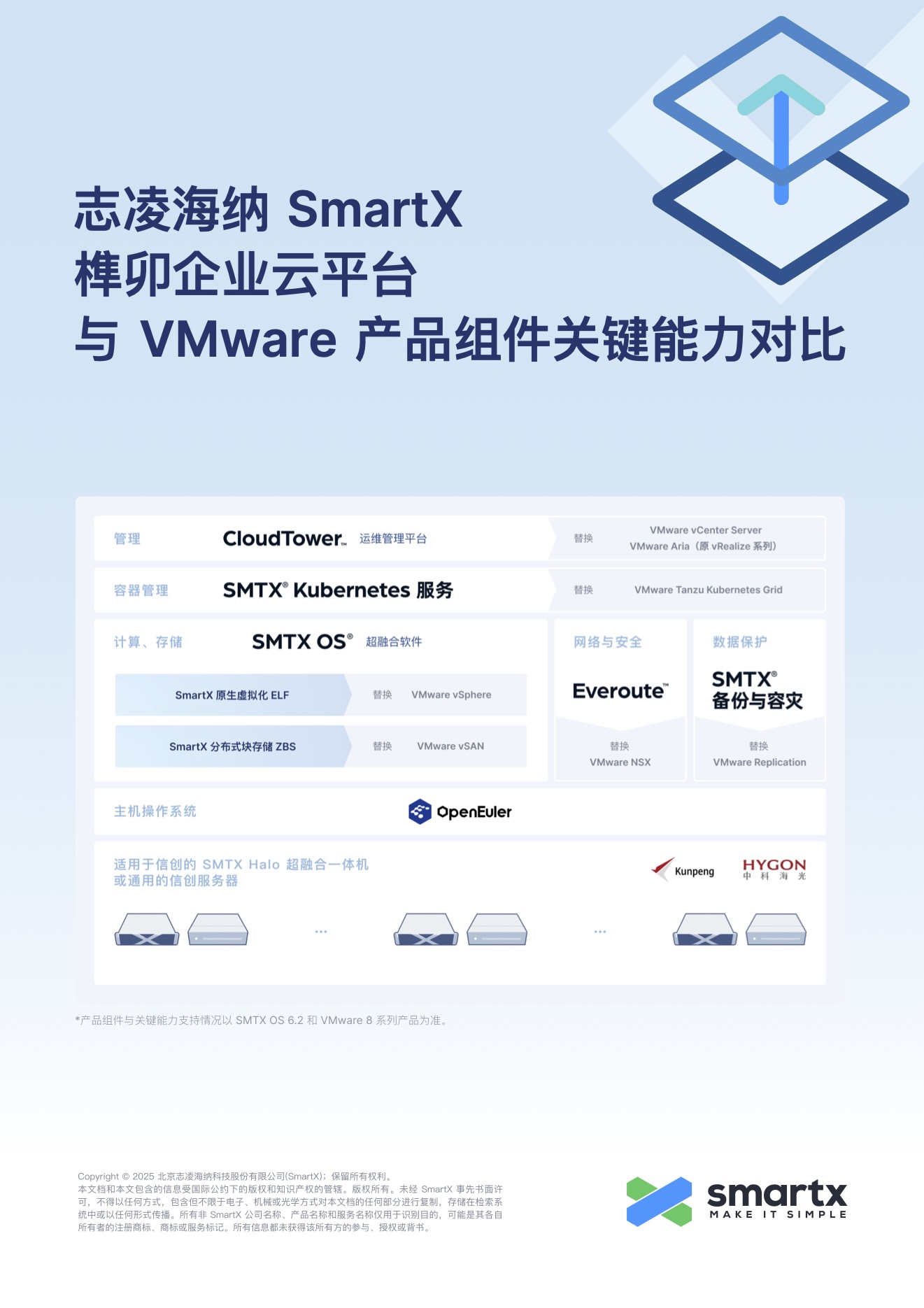 本文档详细对比 SmartX 榫卯企业云平台与 VMware 基础设施产品组件的关键能力,包括计算、存储、网络与安全、集群管理、容器管理和备份与容灾。